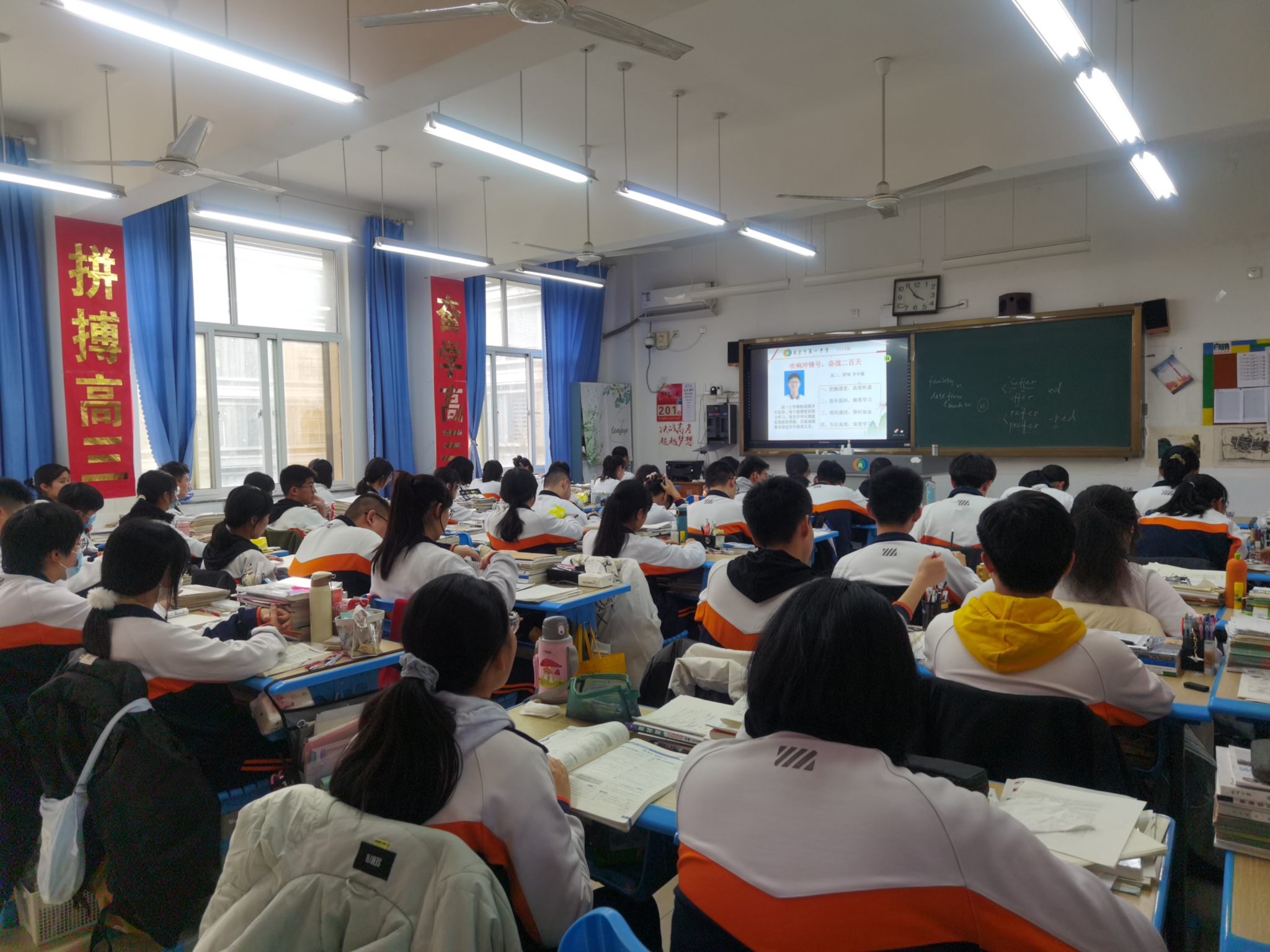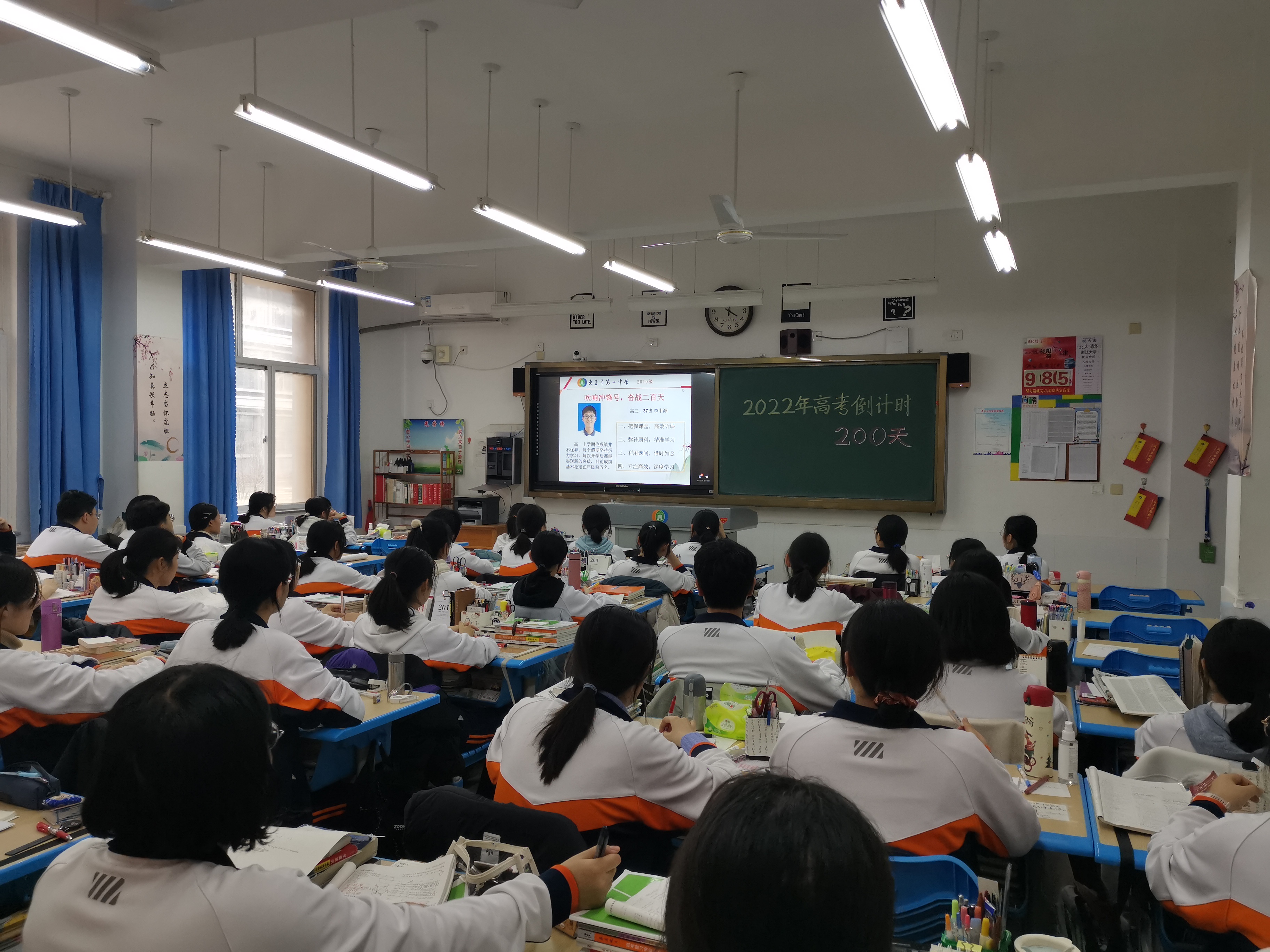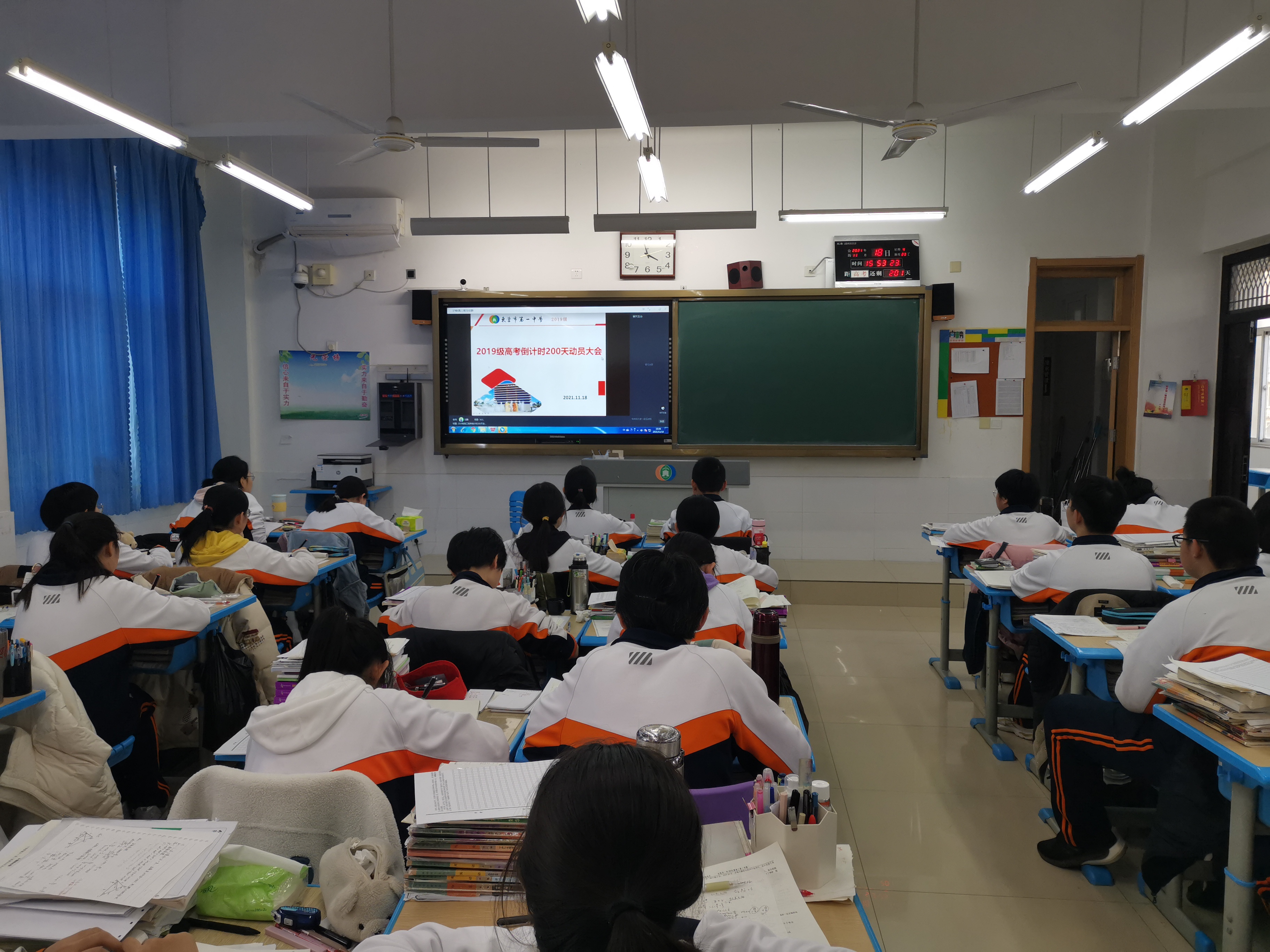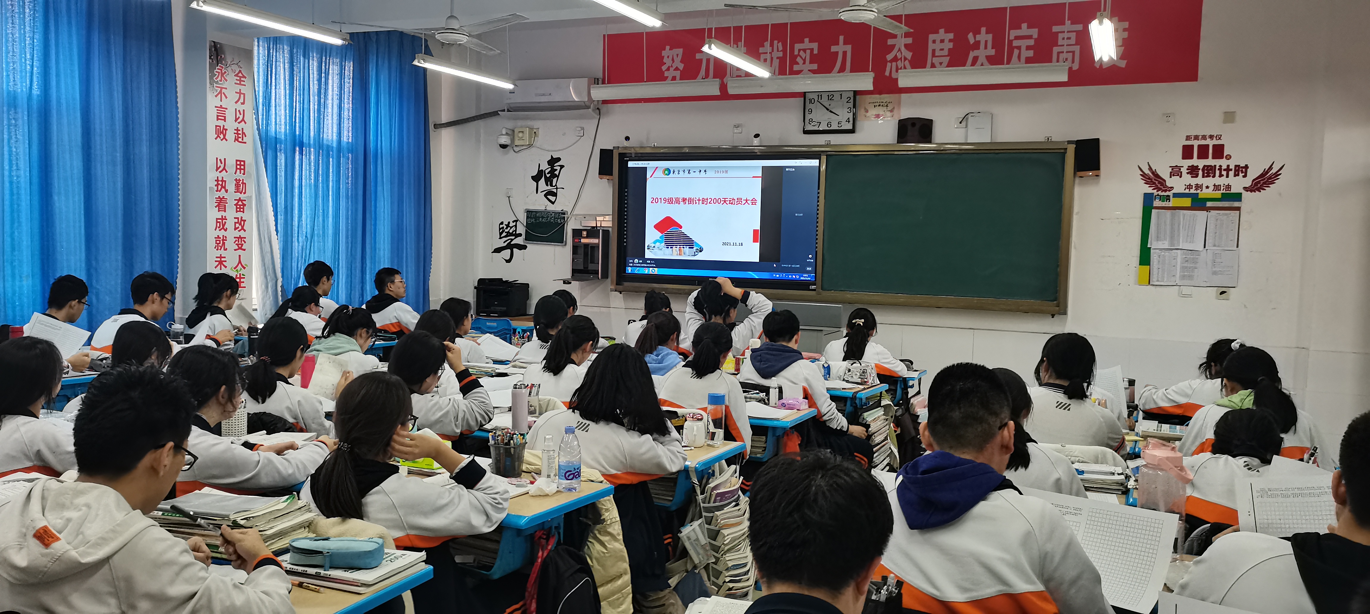 奋斗是石,敲打出星星之火;奋斗是路,指引我们走向新的征程。为进一步激发高三全体师生备战高考的昂扬斗志和必胜信念,2021年11月18日下午,在距离高考200天之际,2019级部组织学生利用钉钉直播的方式,召开高考倒计时200天动员大会。会议分级部宣讲、班会动员、学生励志三个阶段,从级部、班级、学生三个层面展开。动员大会召开得如火如荼。
