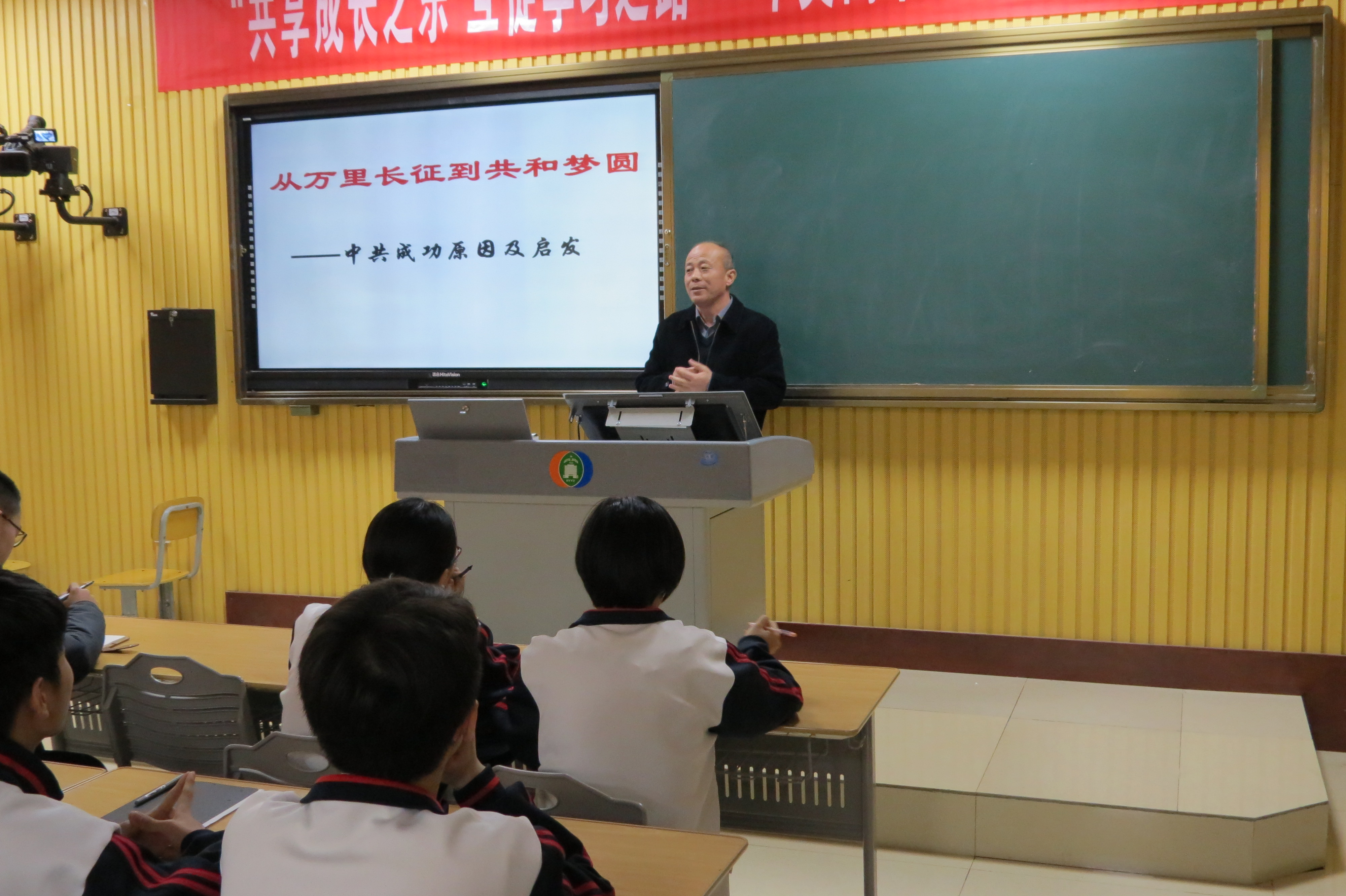第一堂课是由历史组德高望重的刘跃国老师主讲《从万里长征到共和梦圆》,客观详实地分析了中共成功的原因及带给我们的启发。讲座中刘老师条理清晰地为我们梳理了中共的成功之路,其讲述幽默风趣而又尊重信史,在轻松活跃的课堂氛围中围绕着中共的成功之路这条主线,深入浅出地阐明了国共关系,中日关系的发展迁移变化,其对毛、蒋二人对中国重要性的表述更是令人耳目一新。刘老师的讲述不仅着眼于大历史的发展,更关注到了同学们自身发展,他以“积极有为,敢于有为,善于有为”三个有为作结,告诫同学们要充分发挥自己的主观能动性,努力去做一个有价值的人,一个对国家有益处的人。