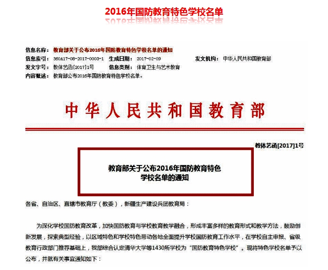 此次教育部共认定1430所学校为“国防特色学校”,其中包括清华大学等32所本科高校和1398所高职、中职、中小学等各类学校。