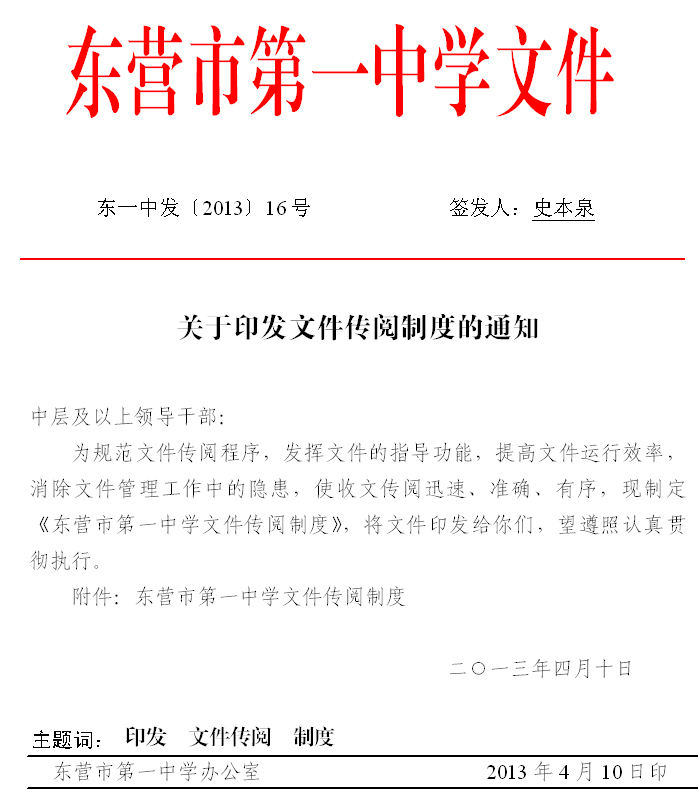 六、切实做好传阅过程中的保密工作。要认真贯彻执行《保密法》和《保密法实施办法》,履行《东营市一中办公室保密制度》。绝密文件由文书专人递送,密件必须标明密级、严密包装,加盖密封章,并履行登记、签收手续,严禁使用普通邮政递送密件,确保党和国家秘密不泄露。
