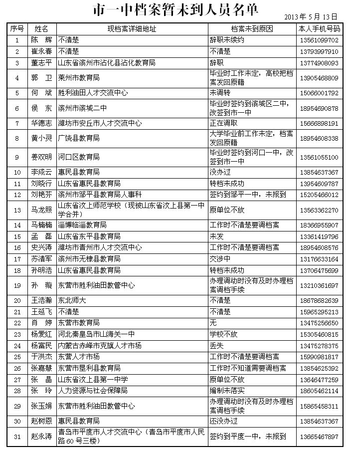 根据市委组织部《关于做好干部人事档案改版有关工作的通知》要求,我校组织开展了2013 年教职工人事档案整理工作。按照市教育局的安排,通过对材料的查漏补缺发现,目前仍有下列职工的人事档案至今没到,请有关教职工高度重视,抓紧查实,寻找下落,办理档案转移手续。市教育局要求该项工作限期在6月中旬之前全部完成。因没有及时转移档案而带来的后果由个人自负。