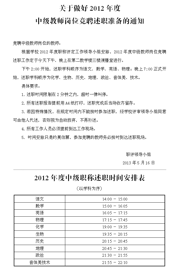 关于做好2012年度中级教师岗位竞聘述职准备的通知