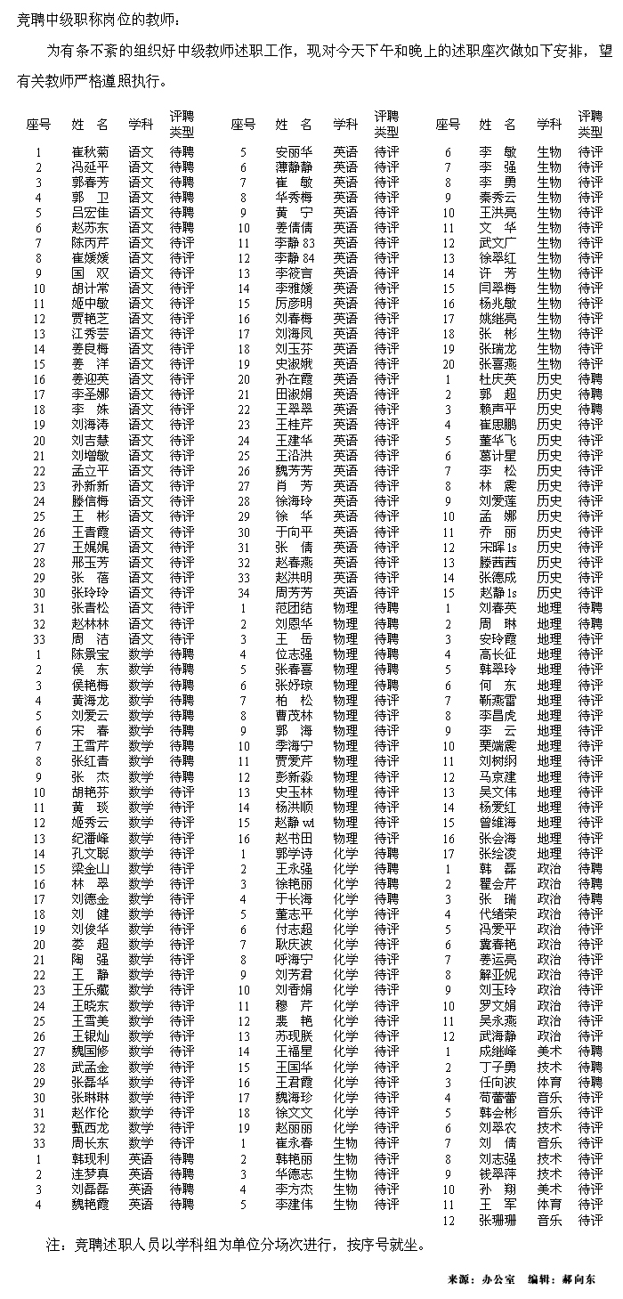 关于2012年度中级教师竞聘述职人员座次安排公示