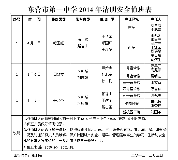 2014年清明节假期安全值班表公示